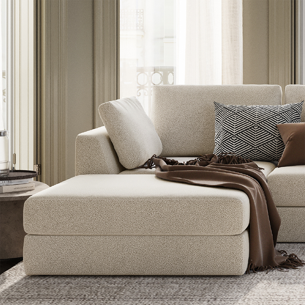 - Hochwertiger, gewebter Boucléstoff – pflegeleicht, strapazierfähig und lichtecht