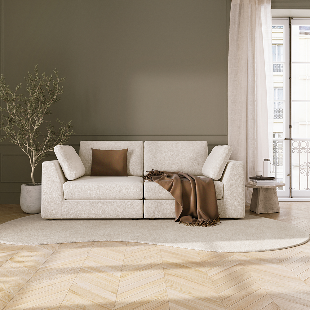 - Hochwertiger, gewebter Boucléstoff – pflegeleicht, strapazierfähig und lichtecht