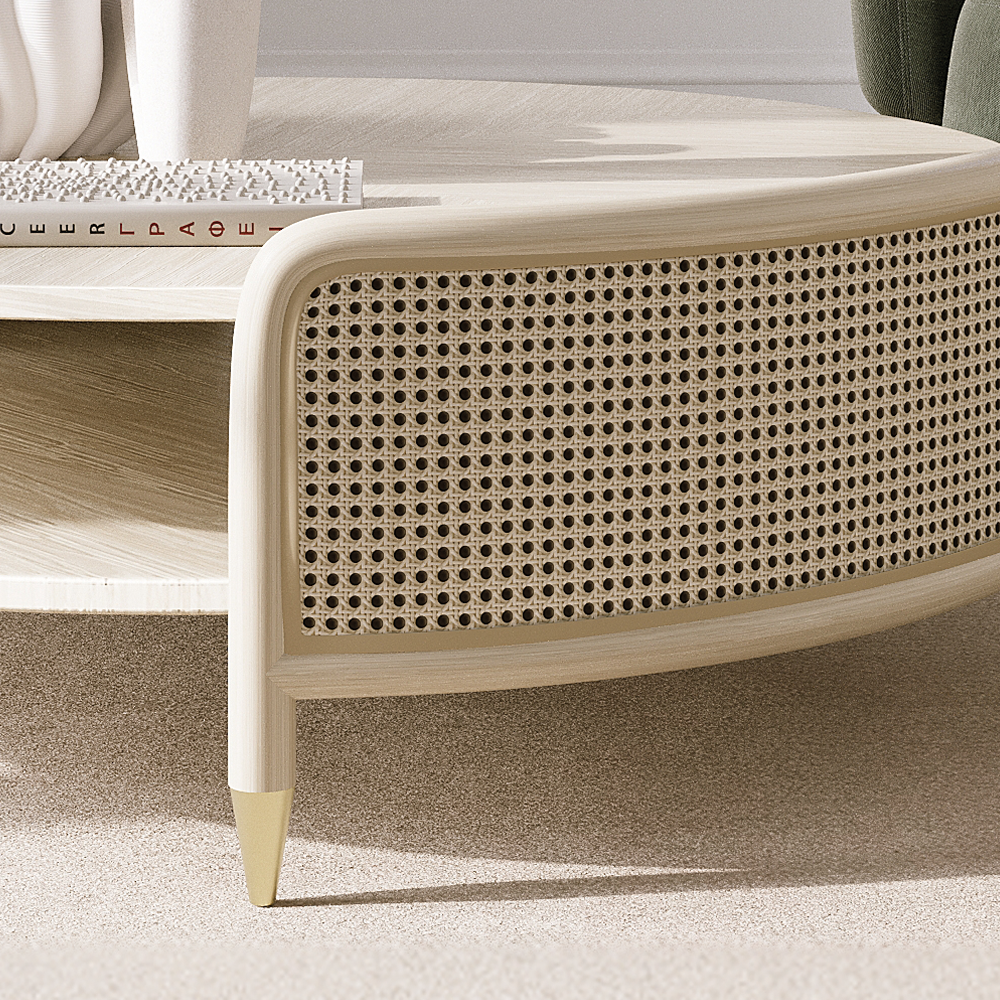 - Zwei feine Natur-Rattangeflechte fassen die Tischplatte seitlich ein und bringen dezente Textur ins Zentrum des Raums.