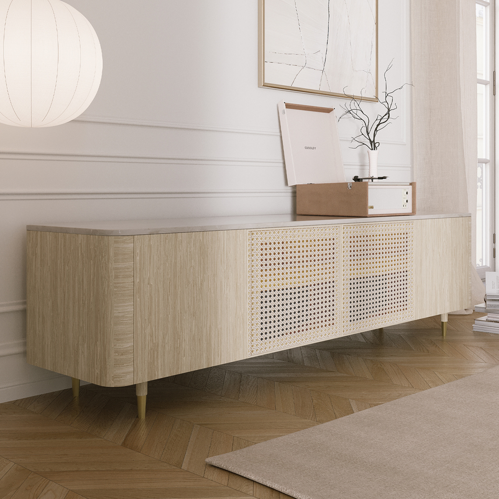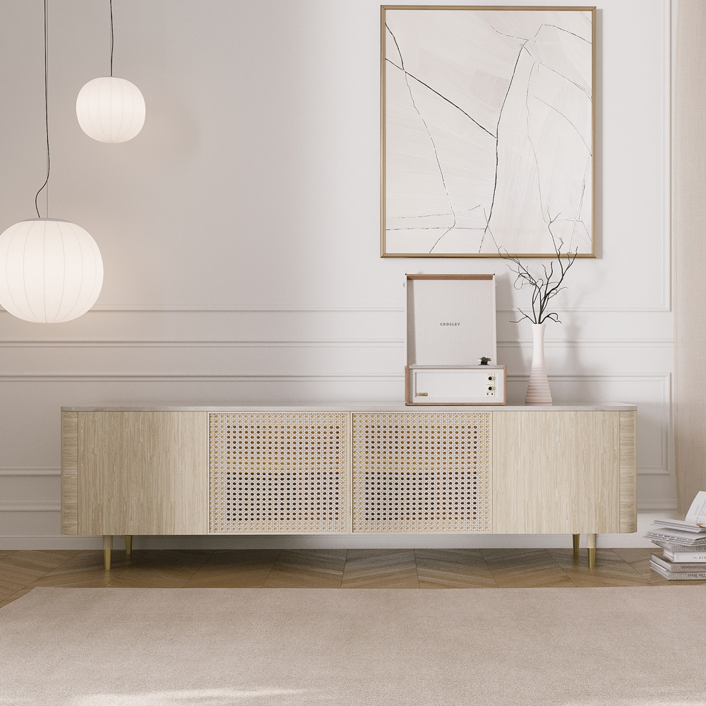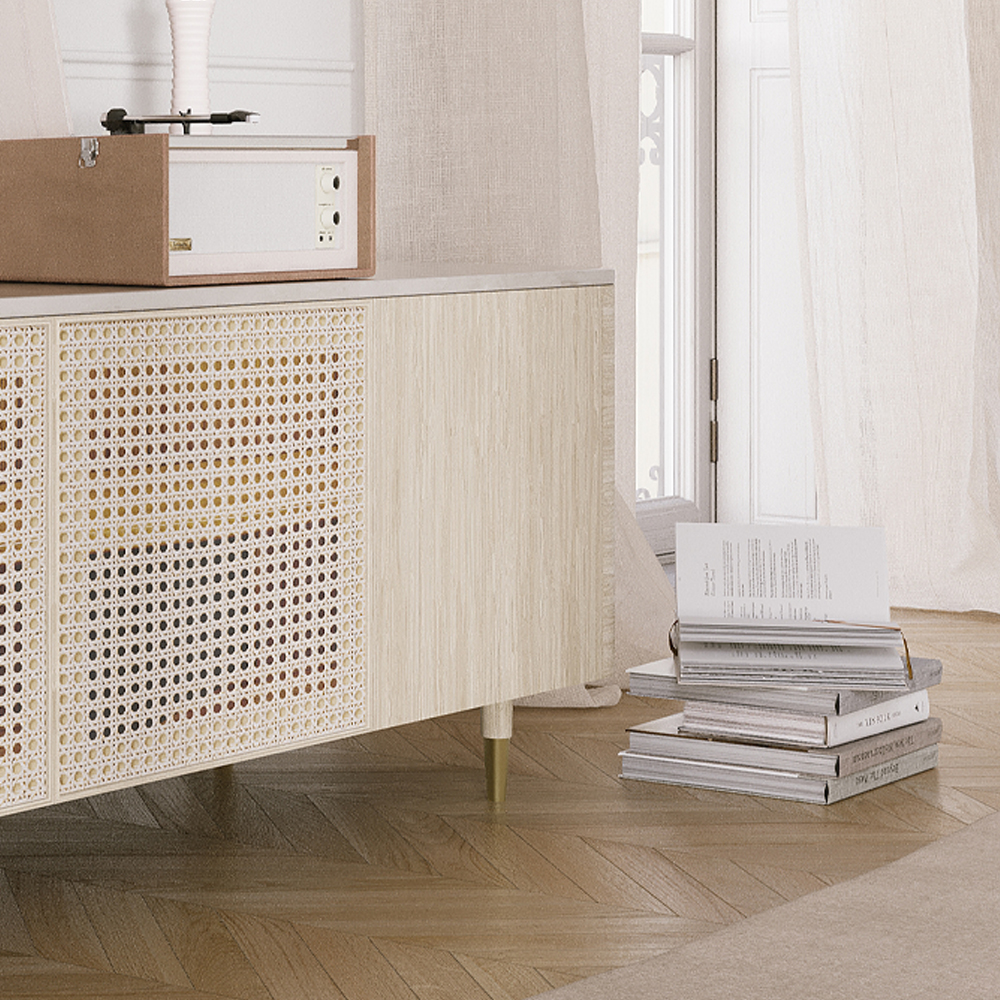 - Hochwertige FSC-zertifizierte Esche Unterkonstruktion mit Eiche Echtholzfurnier und Natur-Rattan schaffen eine natürliche Oberfläche mit ruhigem Charakter.