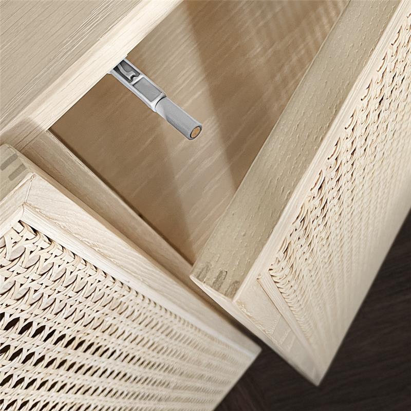 - Push-to-open-Türen und der bewusst offene Mittelbereich mit Kabelauslass schaffen grifffreies Design und flexiblen Raum für Medientechnik oder größere Objekte.